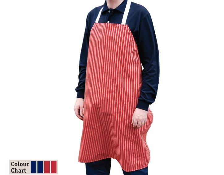 Proofed nylon oxford bib striped apron, lightweight and flexible, wrap around minimum tangle ties, water resistant.