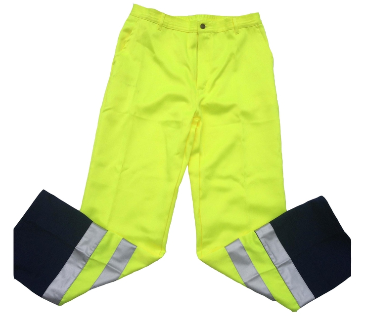 Part elasticated waist, belt loops, zip and fly button fastening, 2 swing/hip pockets, 1 rear pocket. EN471 Class 1/2.