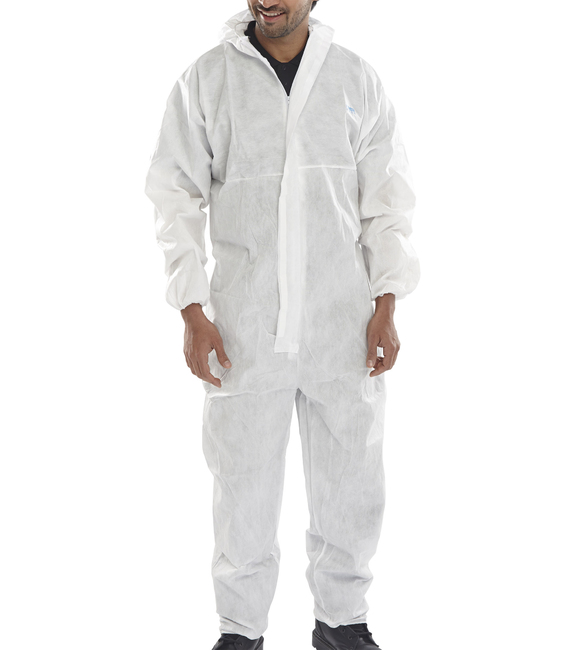 Protective coverall CE Type 5 & 6 for fine dust particles,reduced spray and limited splash. • 2 way zip front with storm flap. • Elasticated cuffs, ankles, waist and hood. • Breathable fabric. • Individually packaged. • Very economical.