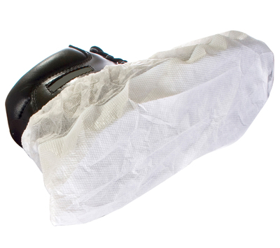Anti slip breathable overshoe in white 45g polythene with a white high slip resistant polyethylene embossed sole. Elasticated top. Length 40cm height 15.5cm, sole width 13cm. Pack = 100, Case = 1000 Shoes.